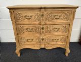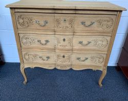 There are three carved drawers and the chest stands on swept legs with escargot feet.