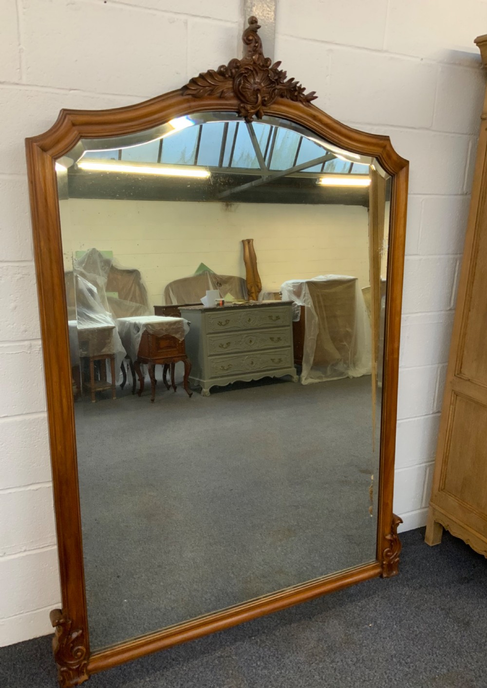 The mirror has ornate carved floral detailing to the top and carved detailing to the bottom.