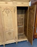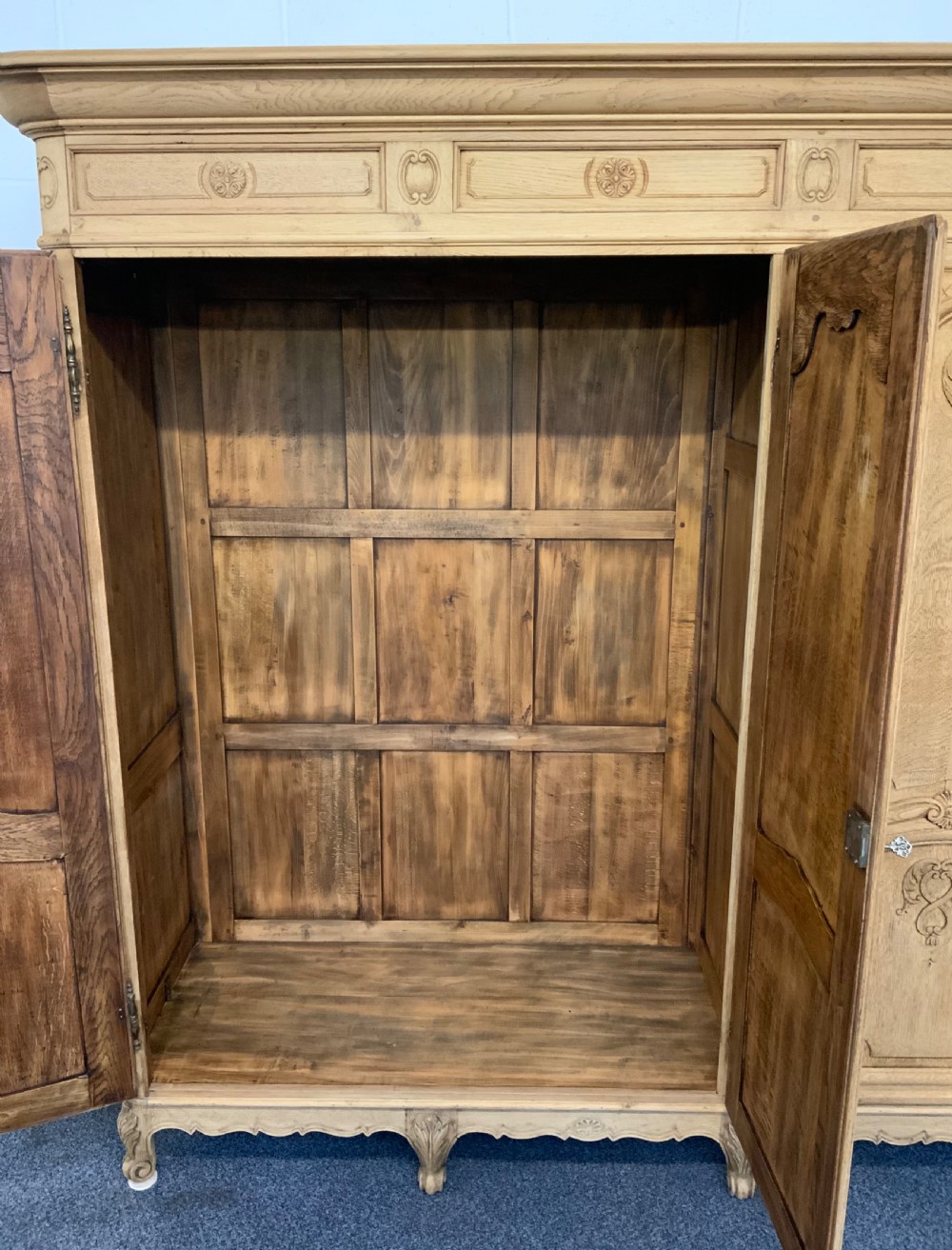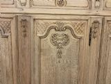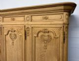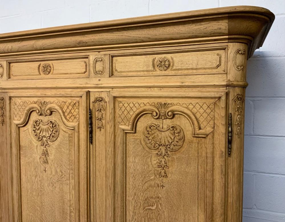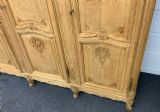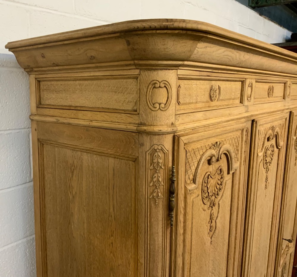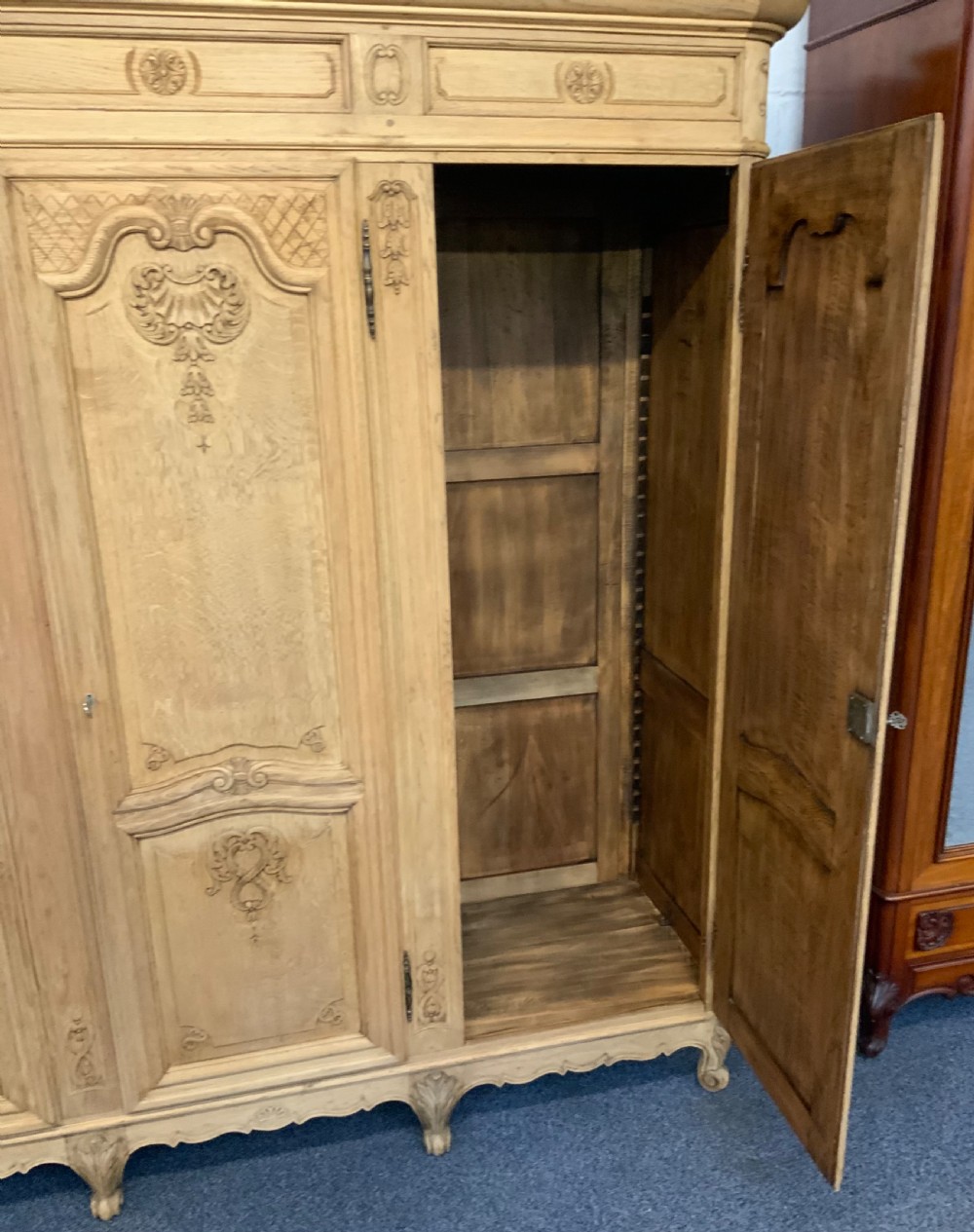 This lovely carved oak bleached French triple armoire is offered in very good condition.