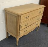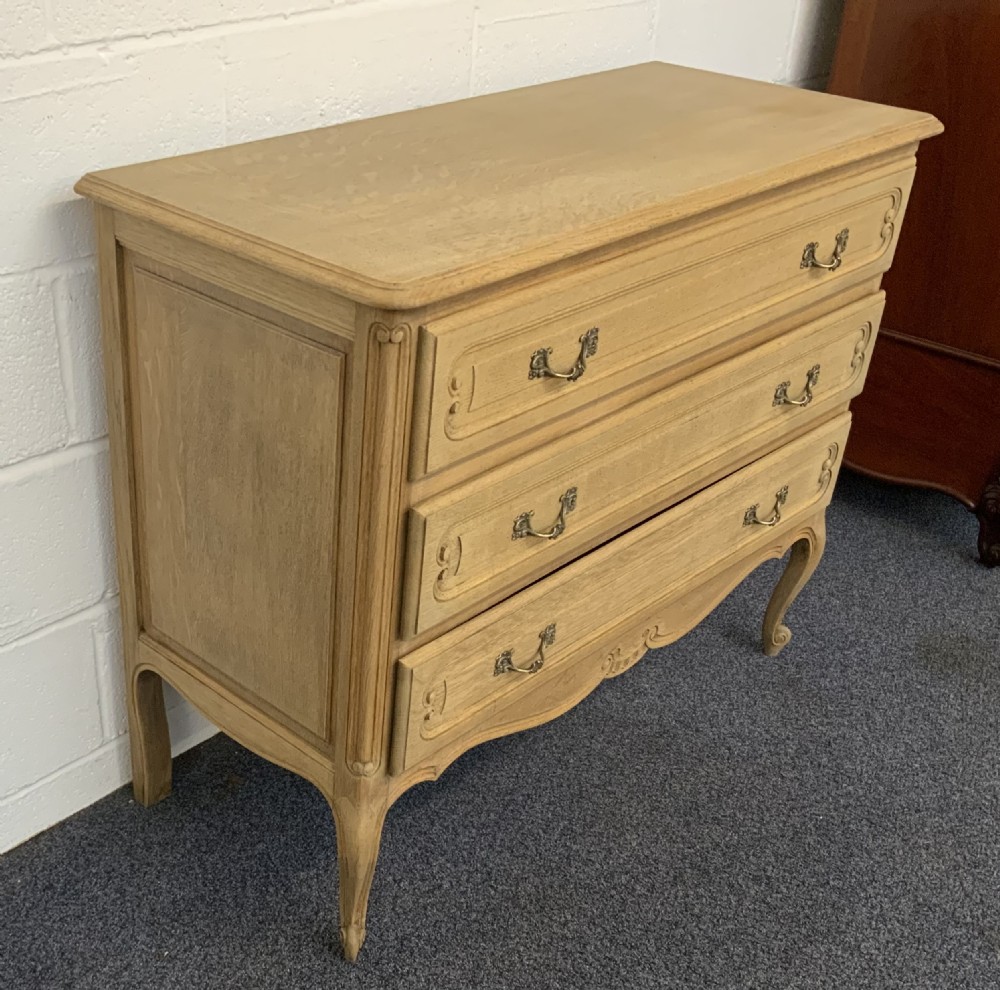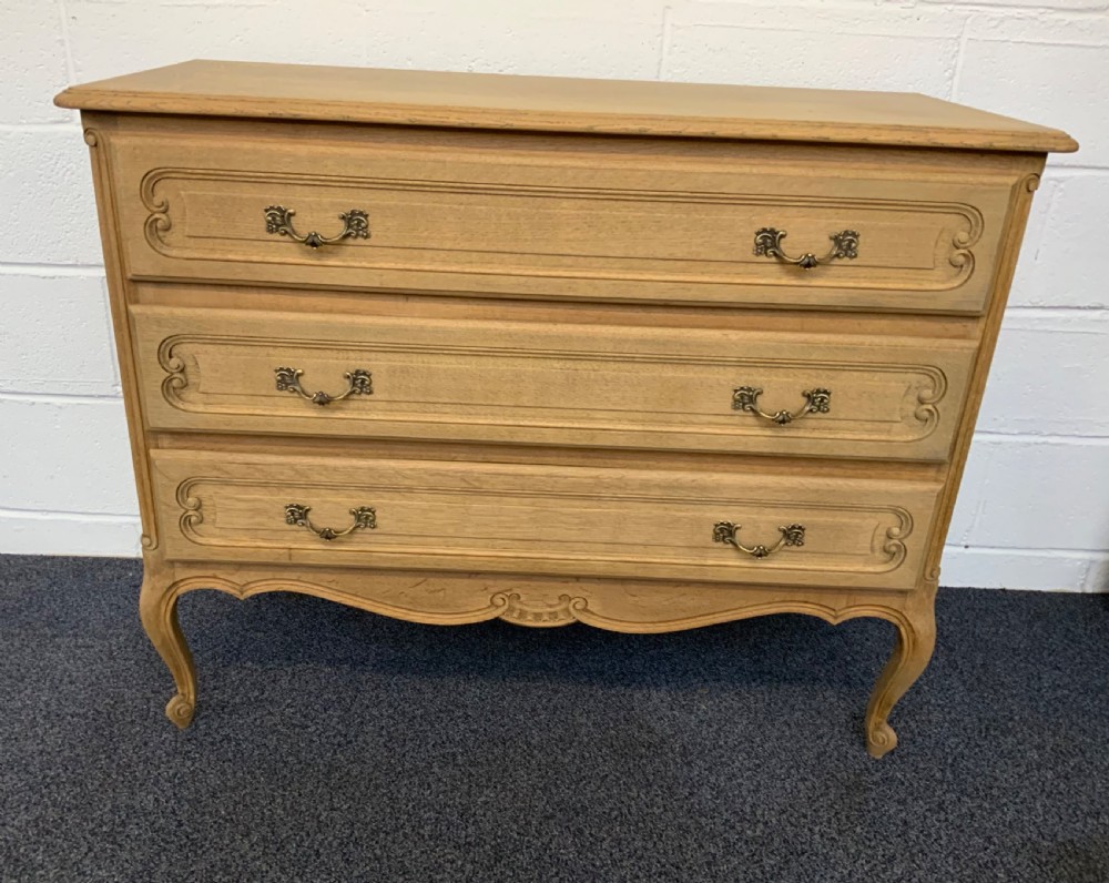 There are three carved drawers and the chest stands on swept legs with escargot feet.