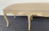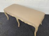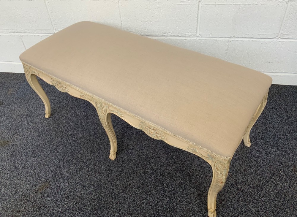 The stool has been reupholstered in a neutral cream linen and finished with a braid.