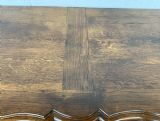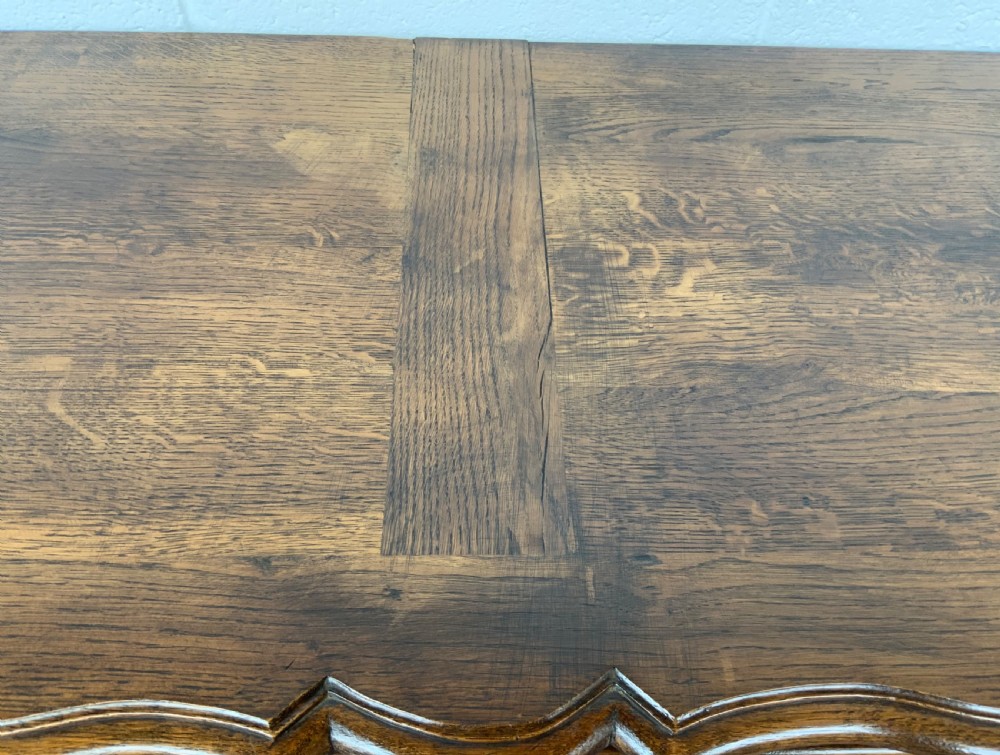 The chest has a panelled solid oak top with swept edges, it has solid oak panelled sides and stands on carved escargot feet.