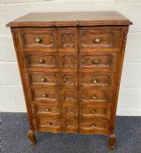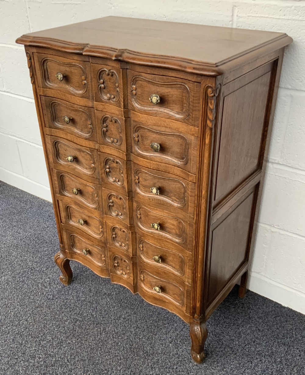 The six drawer chest has original brass handles with carving to the centres.
