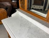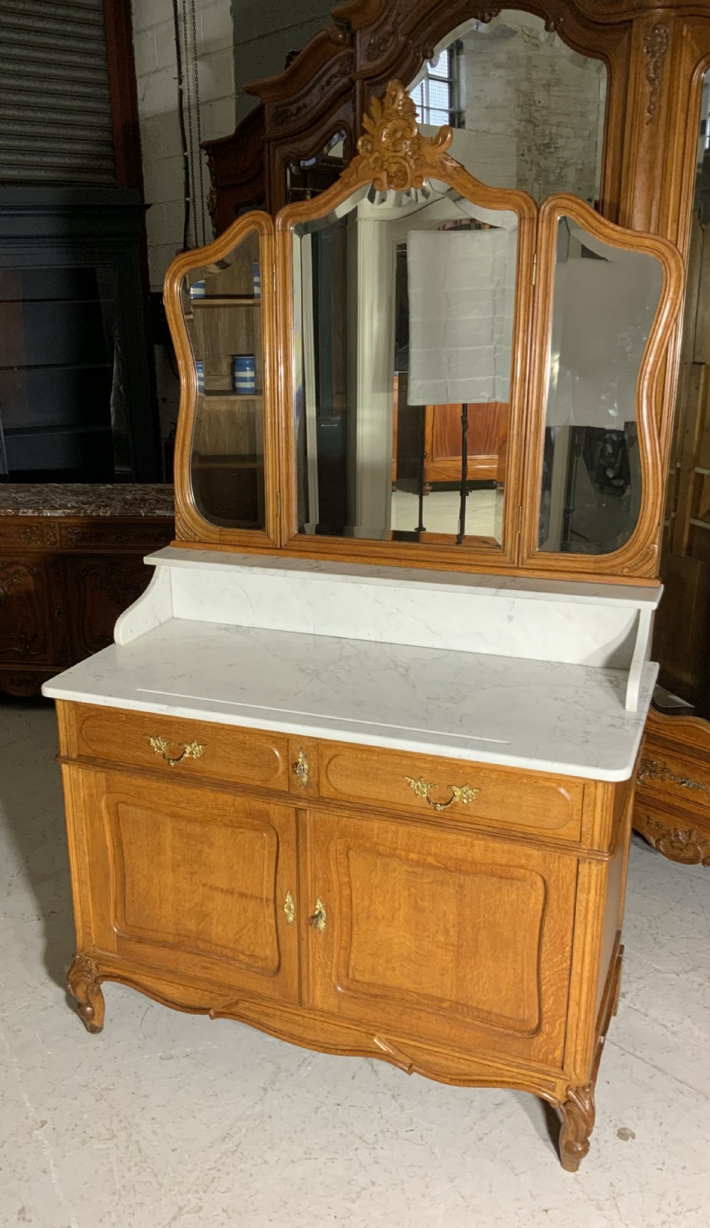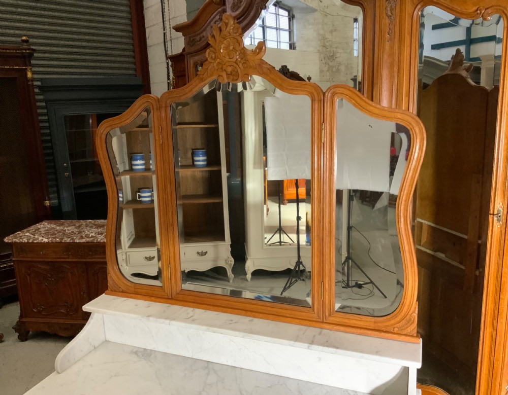 The dressing table has a carved triple mirror with a marble top and a cupboard base with drawers.