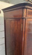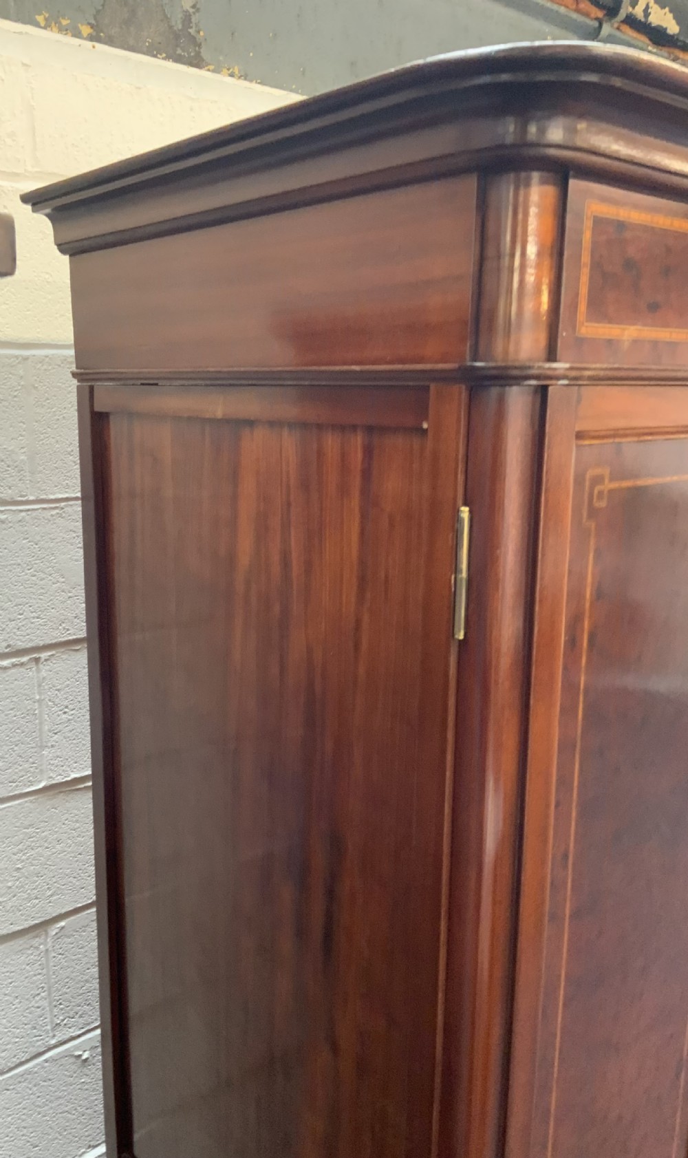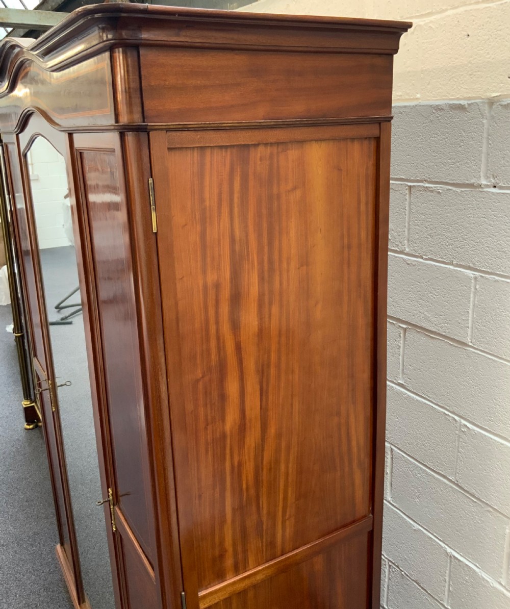 The armoire stands on turned mahogany legs and has an inlaid swept canopy.