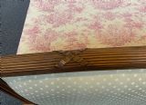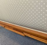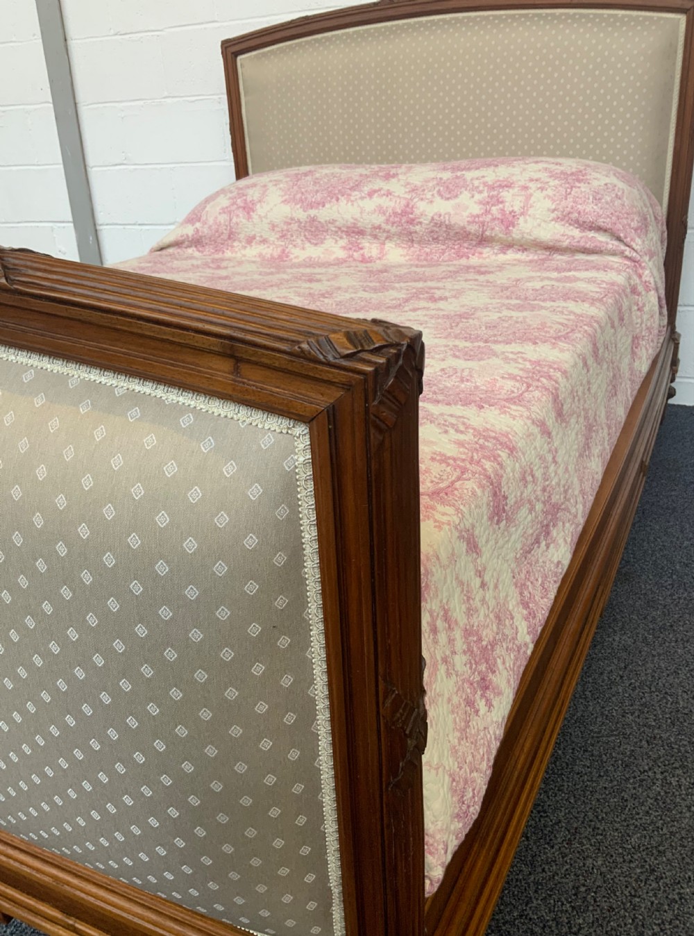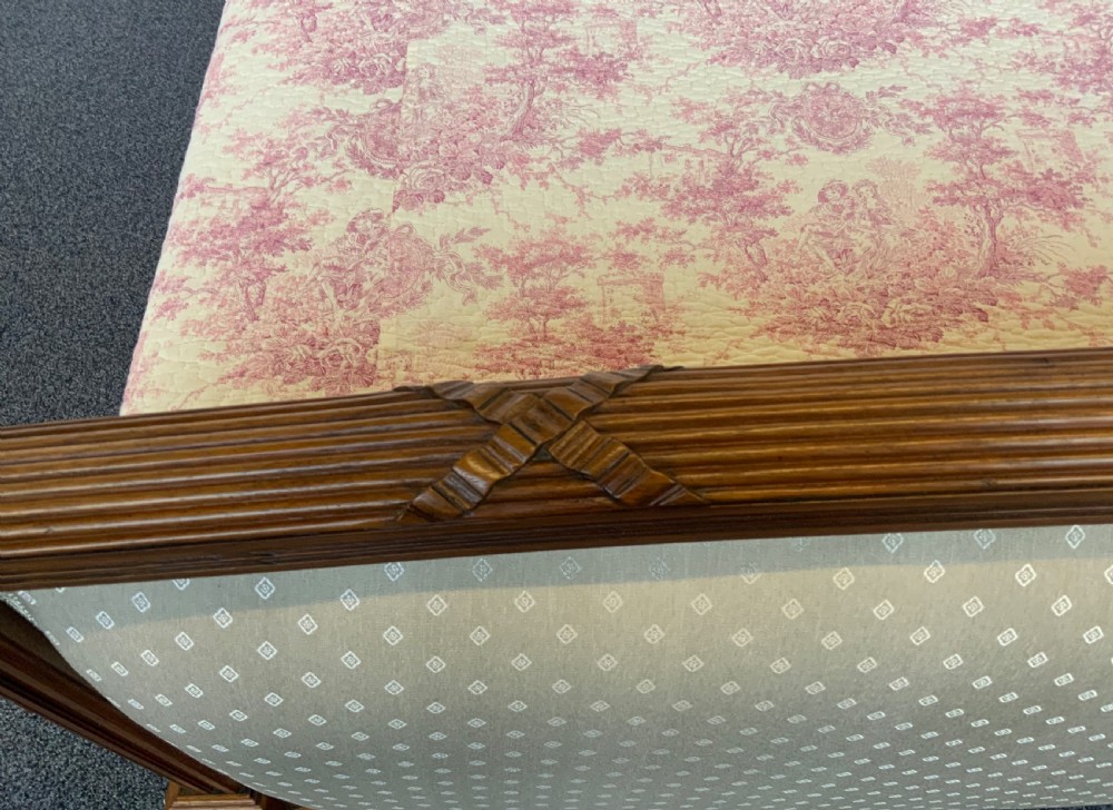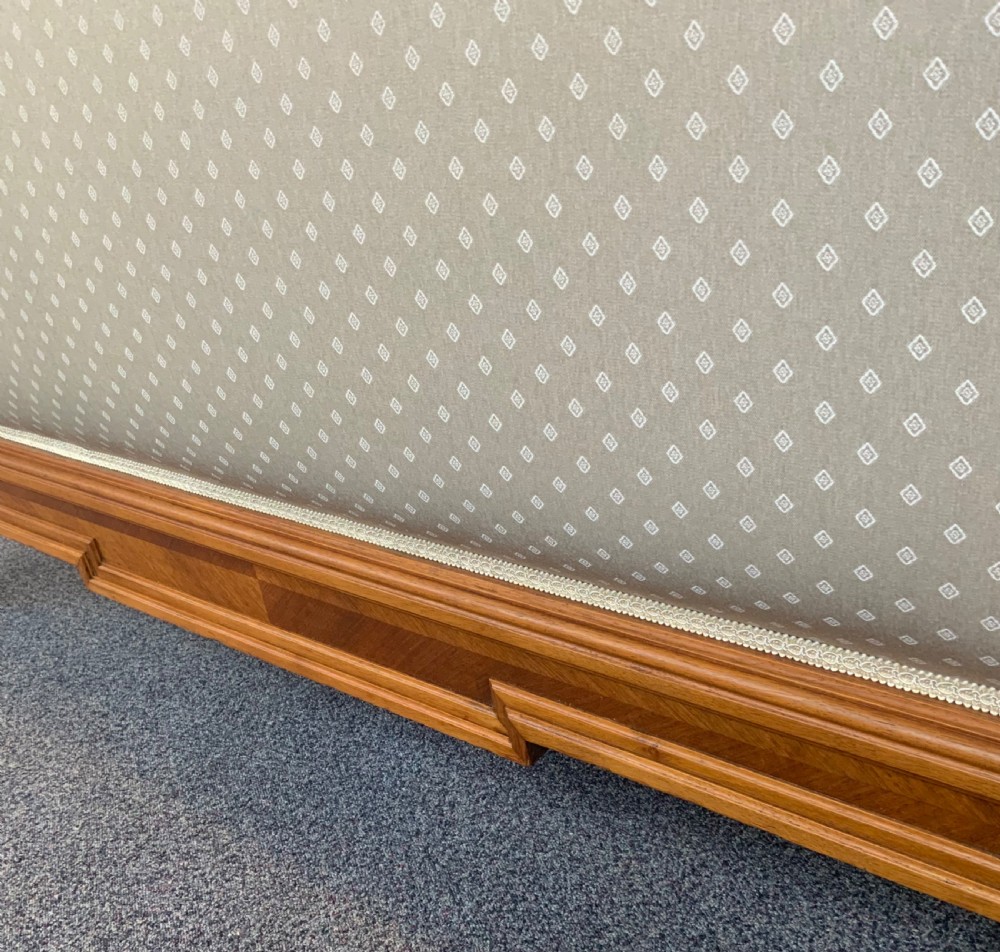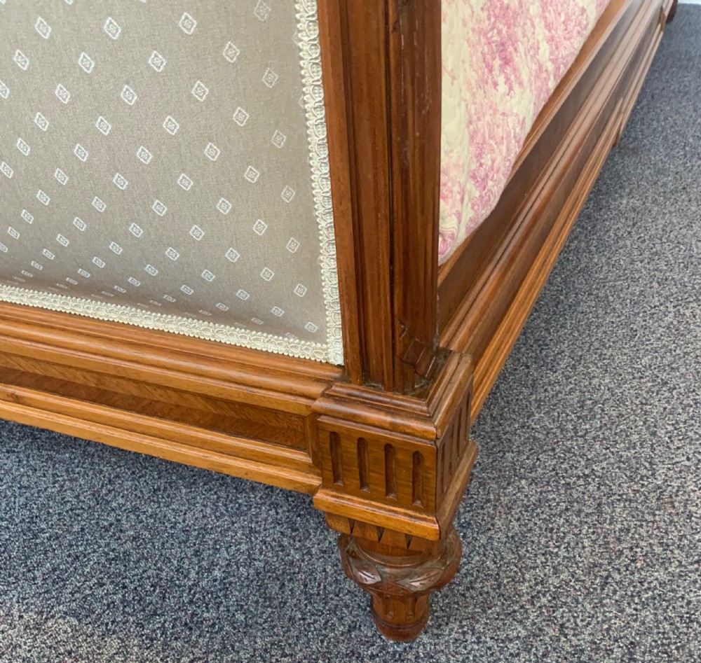 The solid walnut bed frame has been cleaned and polished and the panels have been newly upholstered in a contemporary fabric.