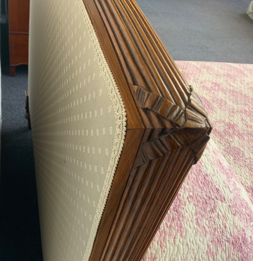 The frame has carved ribbon detailing and stands on carved turned walnut feet.