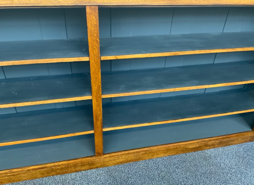 The oak bookcase has been repolished and the interior has been painted in a farrow and ball railings.