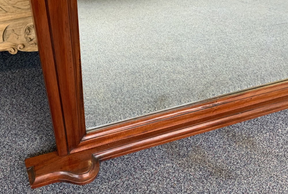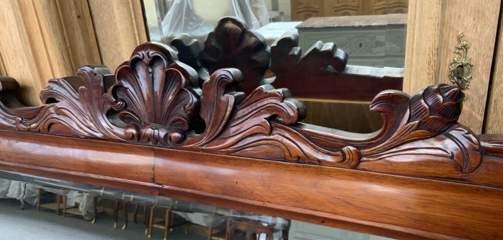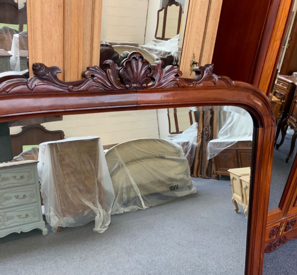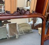 The mirror has ornate carved floral detailing to the top and detailing to the bottom.
