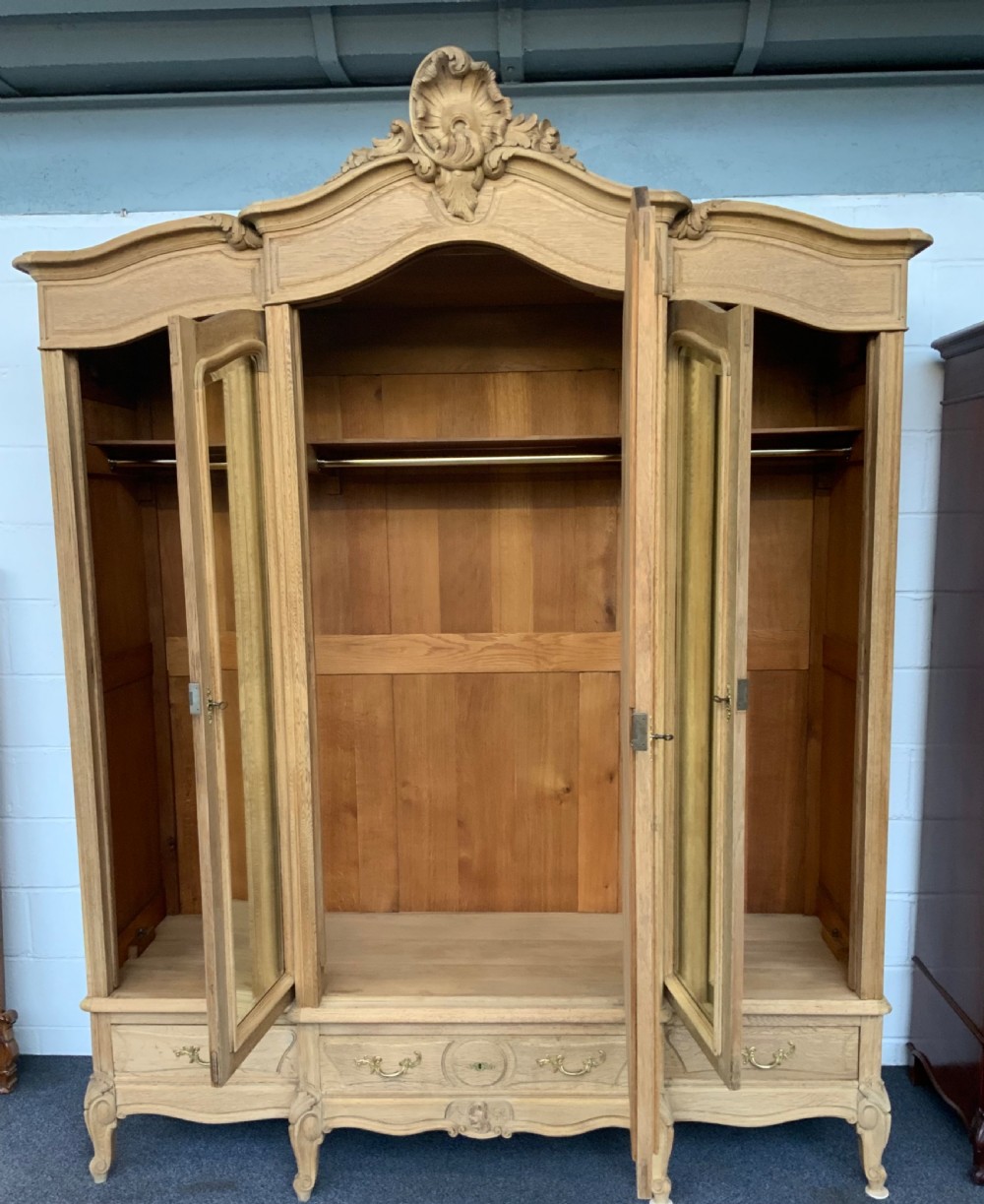 The armoire has a breakfront centre mirrored door and two mirrored side doors.