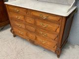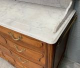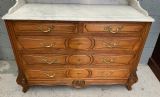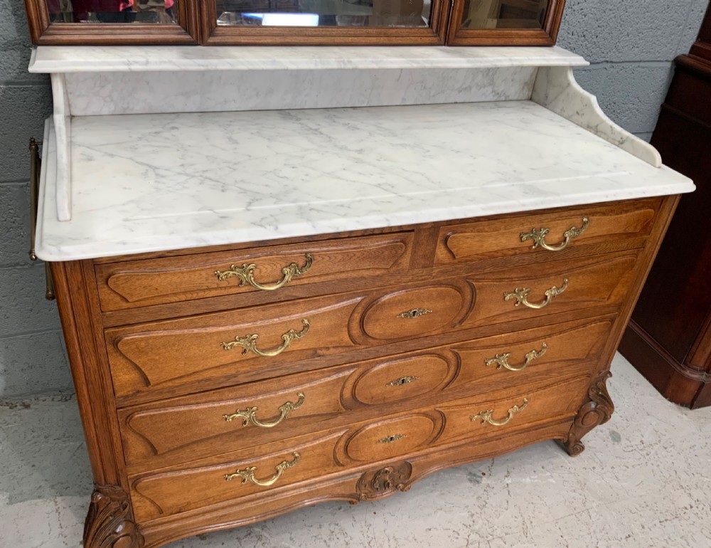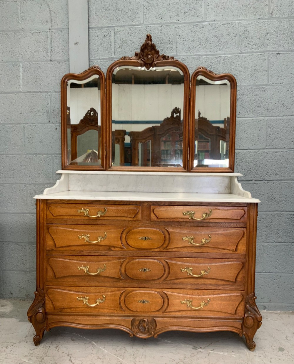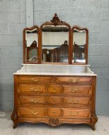 The dressing table has a carved triple mirror with a marble top and a drawers base.