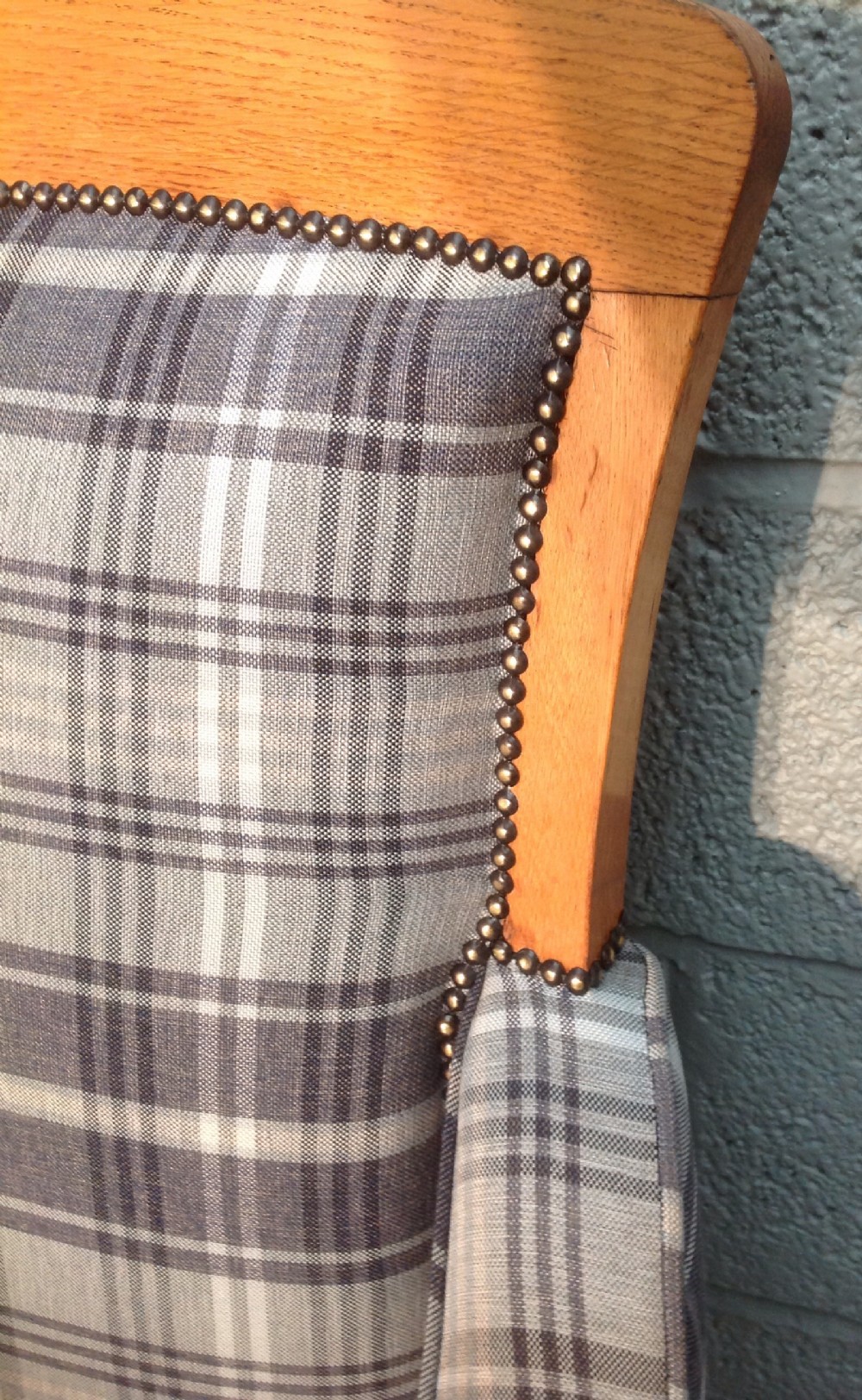 The chair has been repolished and reupholstered in a contemporary tartan fabric.