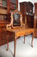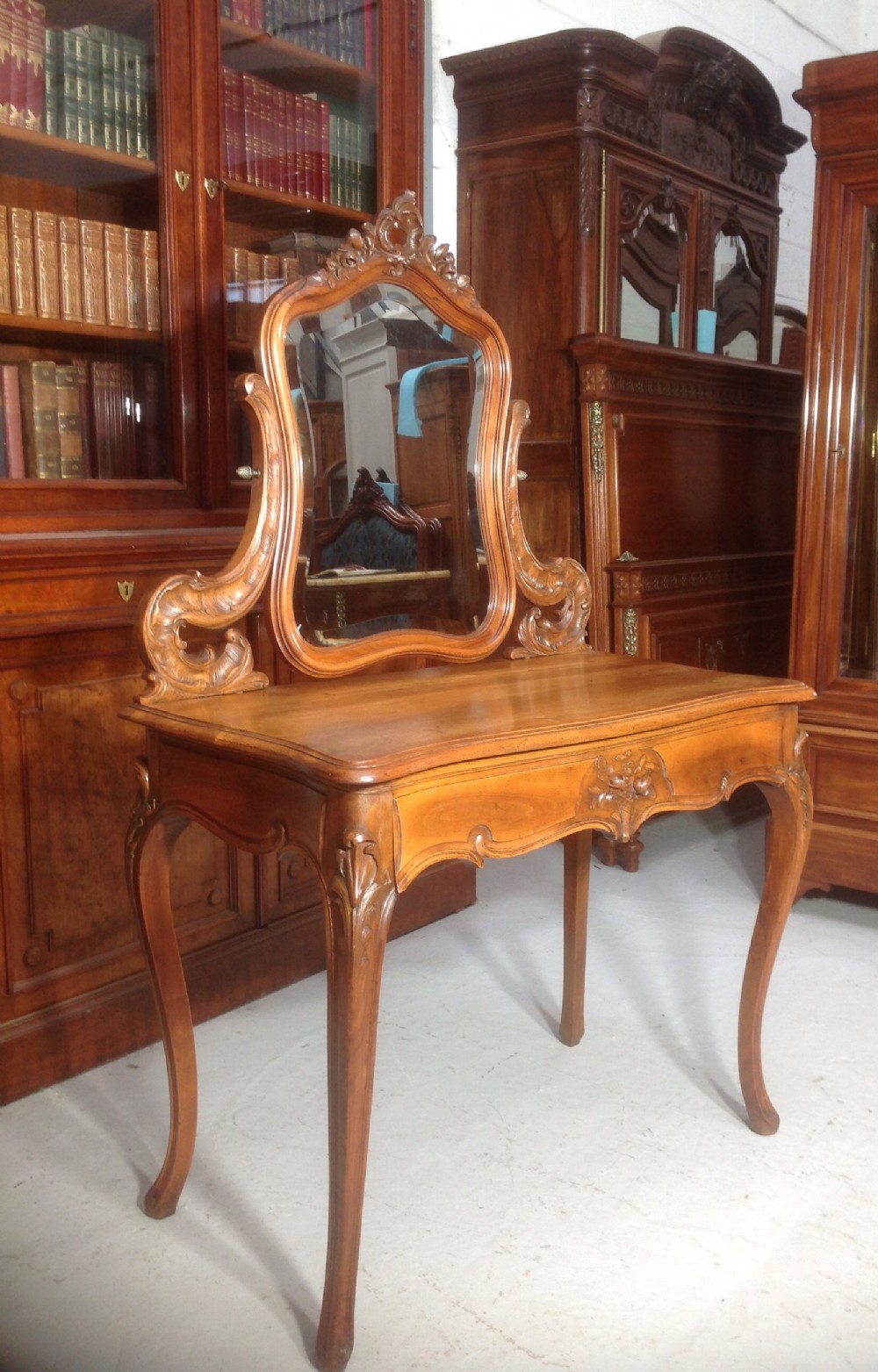 The dressing table has a lovely shaped mirror with a carved top, the mirror is supported by carved swept arms.