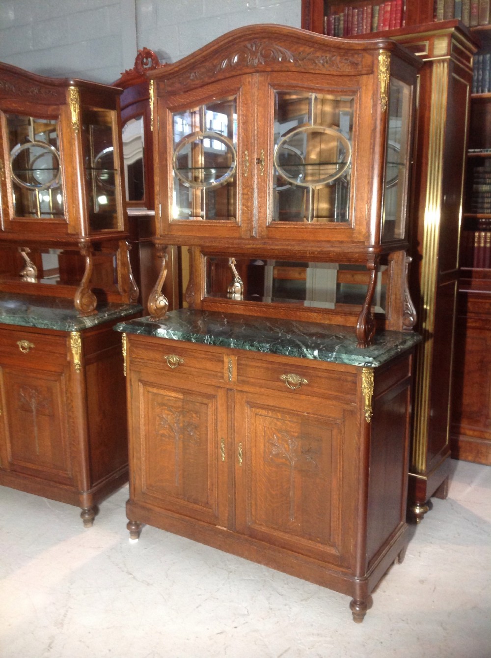 The glazed tops are supported by oak framed mirrors to the back and carved oak supports to the fronts.